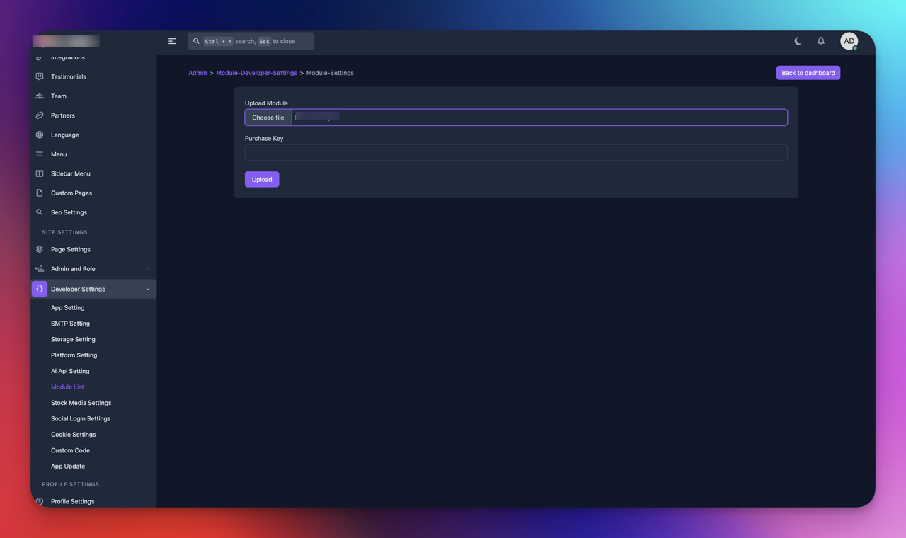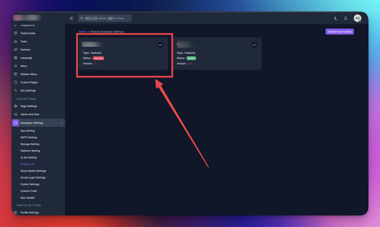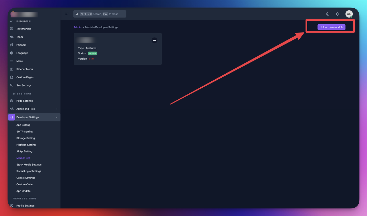 go to your socialai application -> admin end -> Developer Settings -> Module List -> Upload new module
